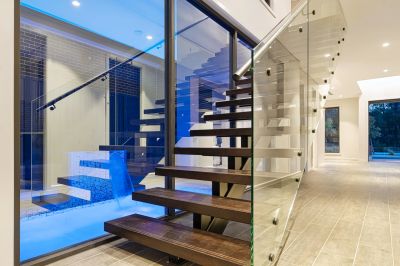 - Prominent swimming pool floodlit by waterfall feature and skirted by glass panels